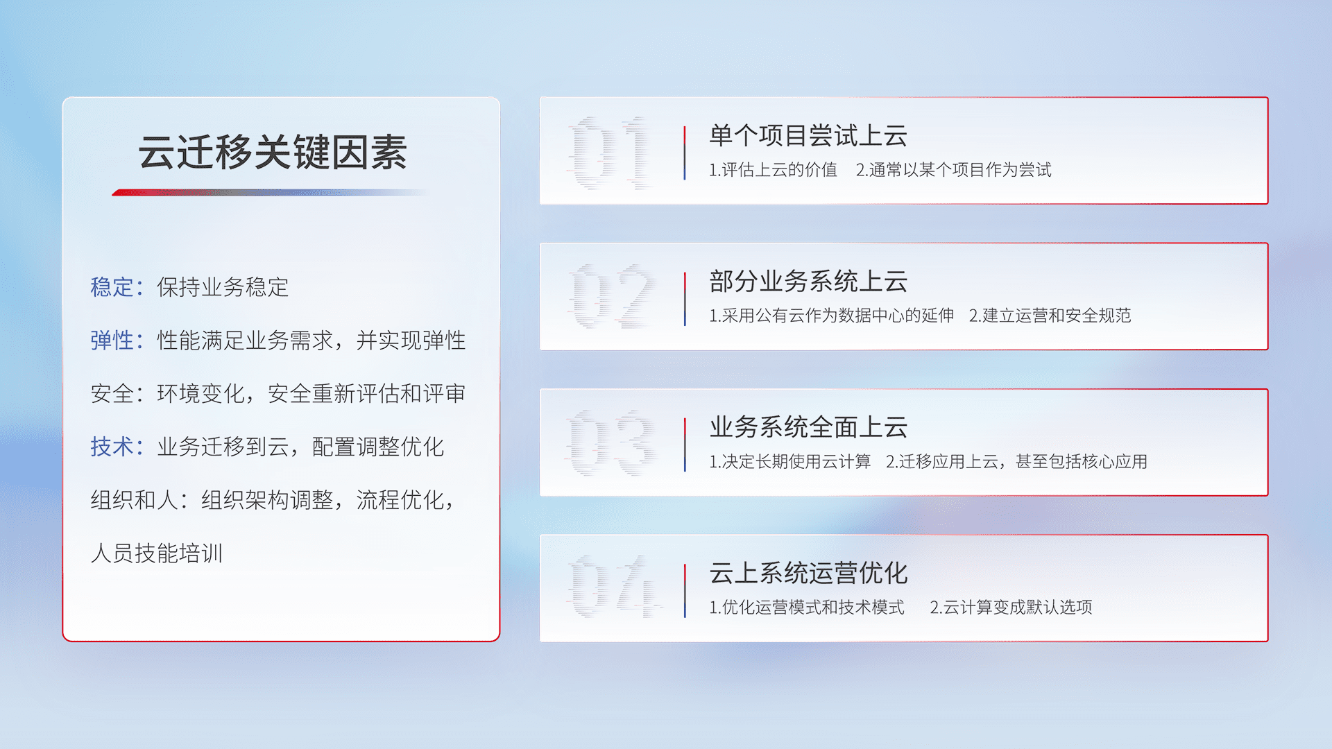 结合实际业务,,,从规划设计、、、云平台选型、、、、云原生改造、、数据迁移、、、集成交付,,迁移全过程为客户识别最佳上云路径,,,,做好风险识别管理,,,设计网络架构、、、、身份权限、、安全审计合规、、、、操作审计、、、日志审计、、监控告警策略、、、多站点容灾设计等,,对云上基础设施进行整体规划,,提升IT治理水平,,,以满足弹性、、、、高可用、、高性能的需求。。。。