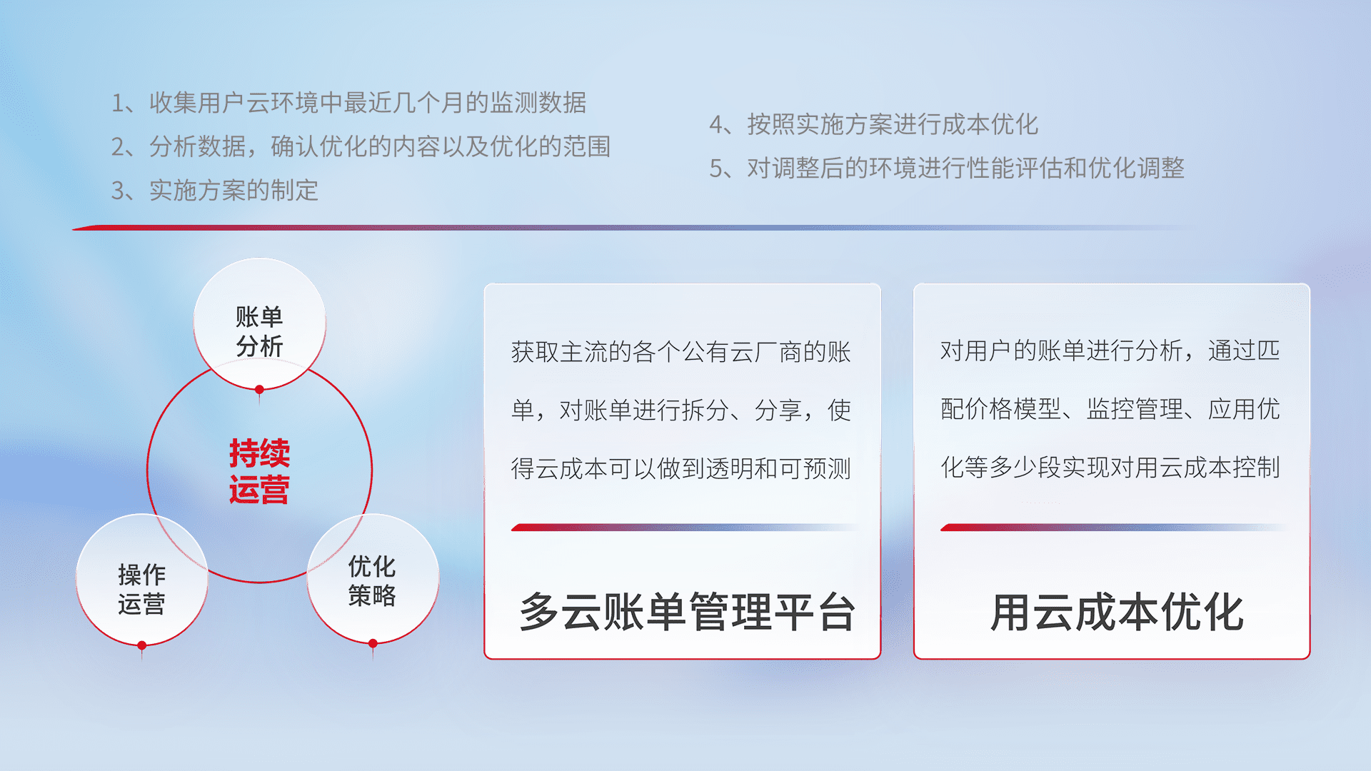 通过多云纳管,,以统一的资源数据模型把客户的云资源进行抽象和封装,,进而实现对多云资源的统一操作,,,,保障云资源管理的可靠性、、、、稳定性与可用性。。。量身定制化运维内容,,,配置、、开发运维、、补丁管理、、、、备份、、、、监控、、、认证和访问管理、、、、审计和日常巡检等,,,保障在用云过程中的可靠度,,,稳定度以及高可用率。。。。