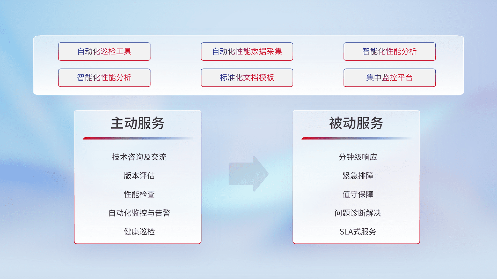 智能化工具和标准化文档,,,保障服务质量,,提供主动服务(包含技术咨询、、版本评估、、、性能检查、、自动化监控与告警、、、、健康巡检)和被动服务包含(分钟级响应、、、紧急排障、、、、值守保障、、、问题诊断解决、、、SLA服务)。。